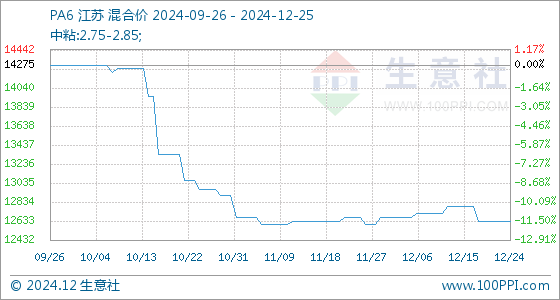 12月25日,生意社PA6基準價為12633.33元/噸,與本月初(12666.67元/噸)相比,下降了-0.26%。