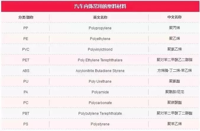 1.塑料 根據樹脂的分子結構和熱性能的不同,塑料分為熱塑性塑料和熱固性塑料。汽車內飾常用的塑料大多是熱塑性塑料,主要包括PP、PE、PVC、PET、ABS等。 汽車儀表板多采用 PVC 和 ABS 材質,再注" />